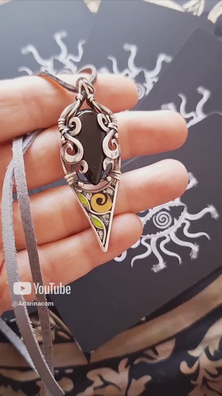 Unique handmade wire wrapped pendant necklace made from high-quality solid sterling silver, natural black obsidian stone and resin. Pendant is one of a kind. Original design by Artarina