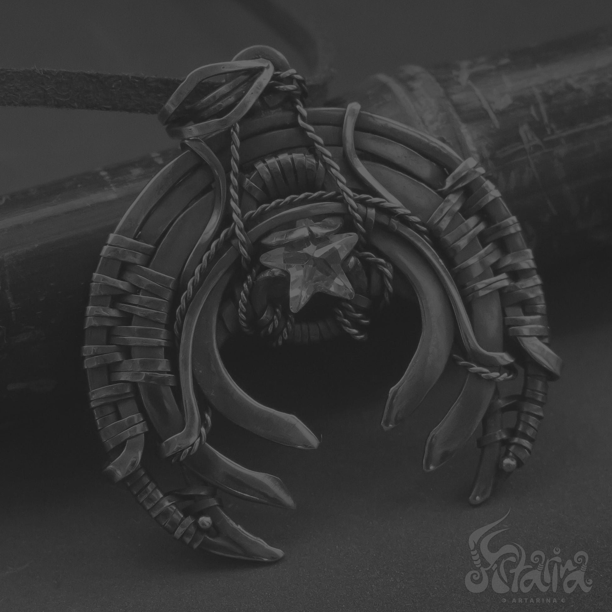 Heady wire wrapped pendant. Moon luna shape crescent pendant Small pink star stone jewelry wirework pendant Star wire wrapped necklace