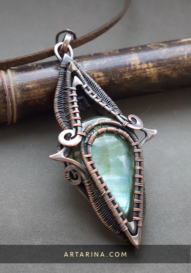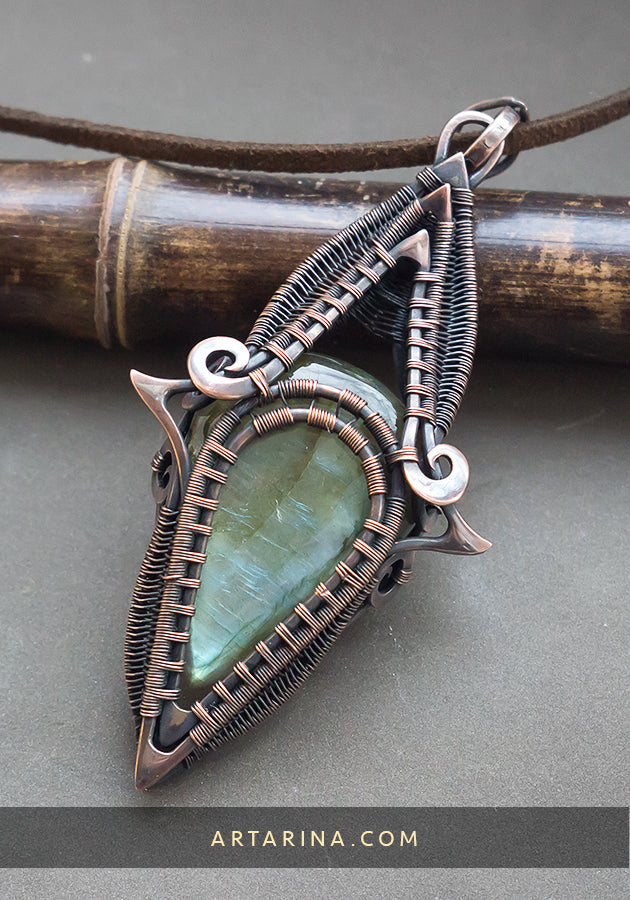Long copper necklace with labradorite gemstone.