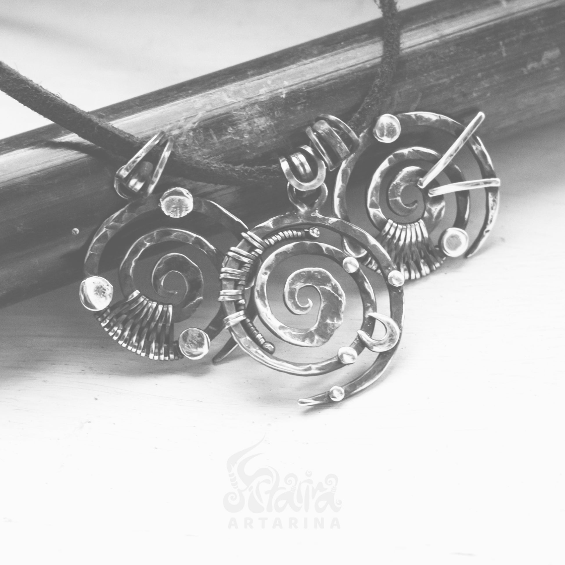 Handmade hand forged wire wrapped industrial style spiral necklace. This pendant is hand cut, shaped and hammered. Spiral necklace is 100% handmade, one of a kind and unique. Original design by Artarina.