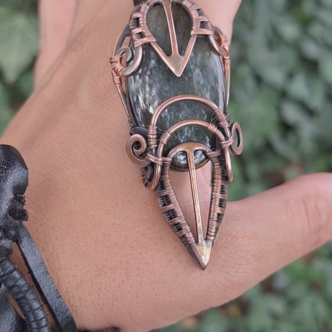 Magic grimoire witch necklace. Mystical green labradorite dragon vein pendant