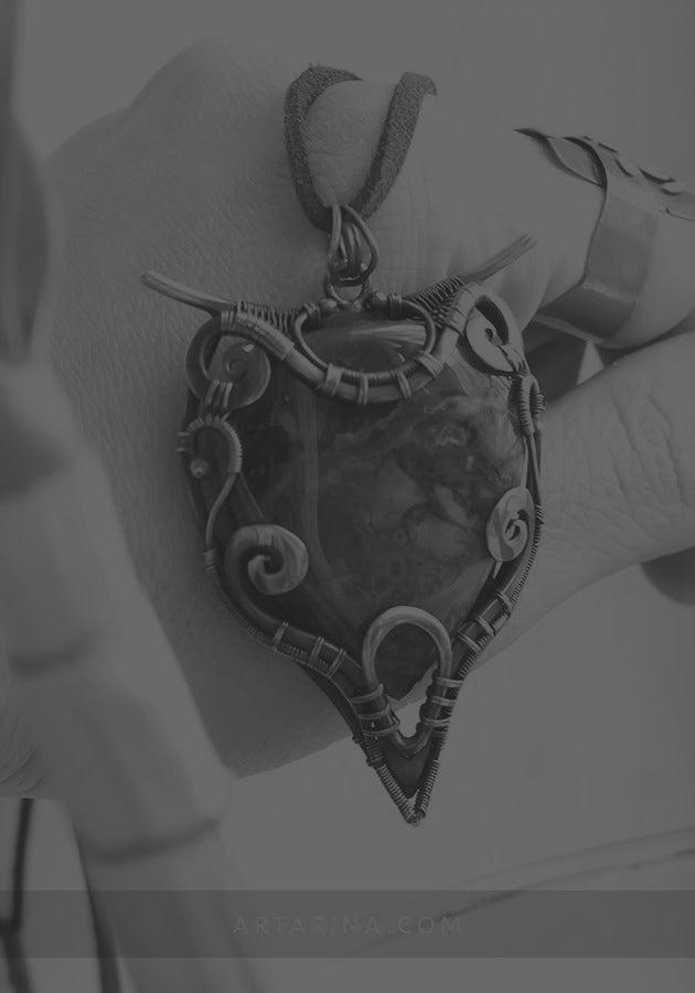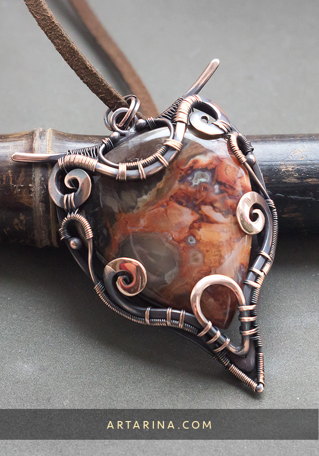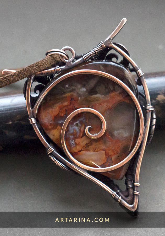 Copper wire art pendant with petrified wood