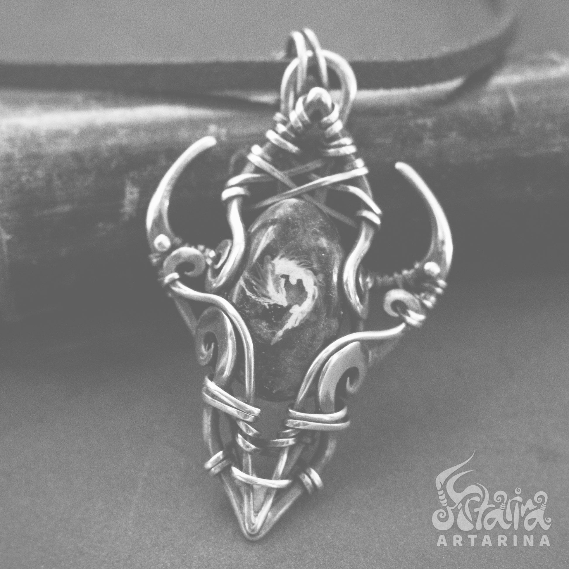 Solid sterling silver (925) wire wrapped necklace with hand painted space dragon resin cabochon. Necklace is 100% handmade, one of a kind and unique. Original design by Artarina
