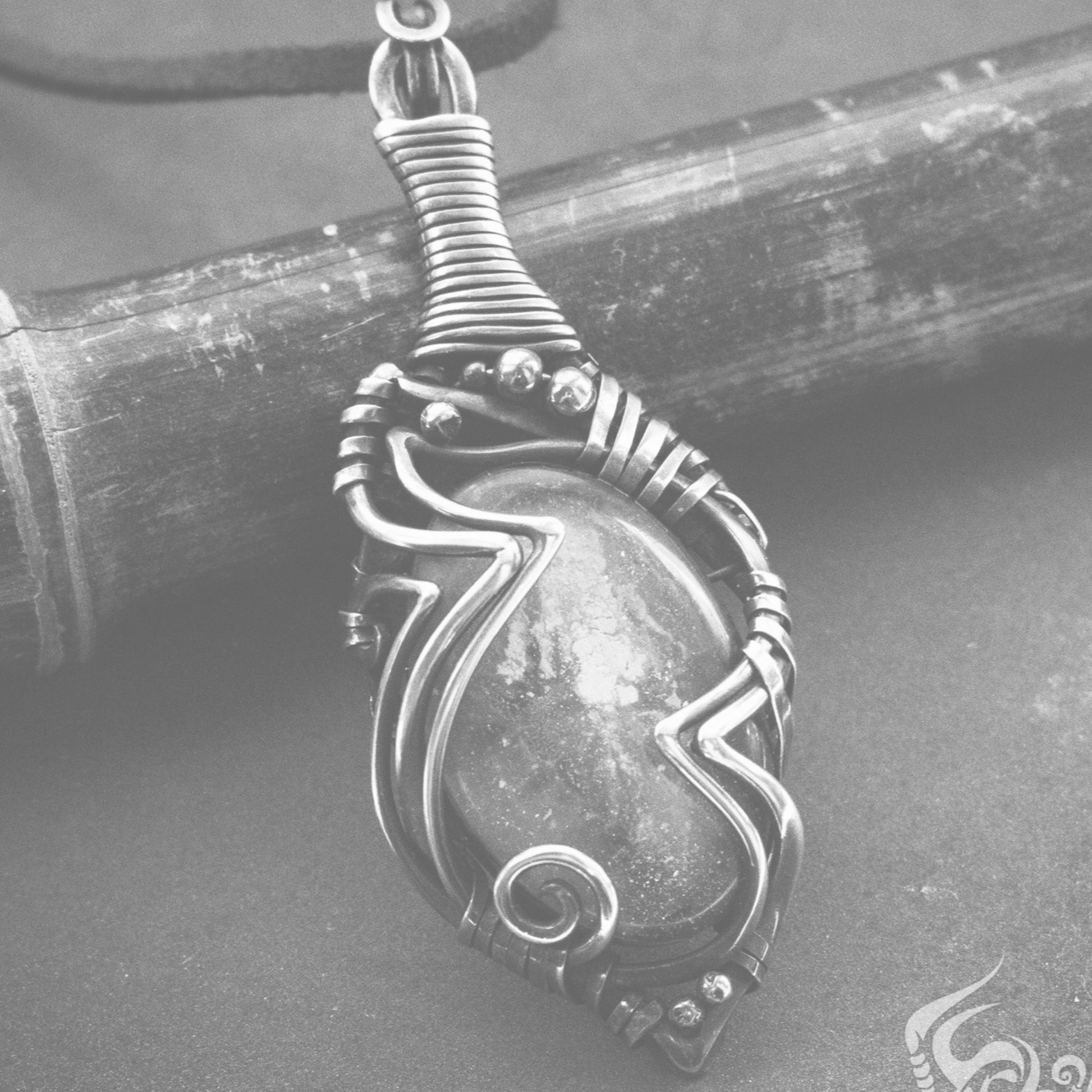 Handmade copper wire wrapped necklace with pink and gold colored handcrafted cabochon. Necklace is one of a kind and unique. Original design by Artarina