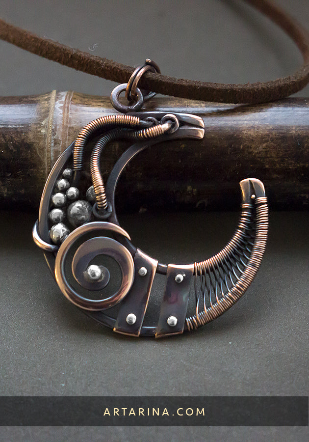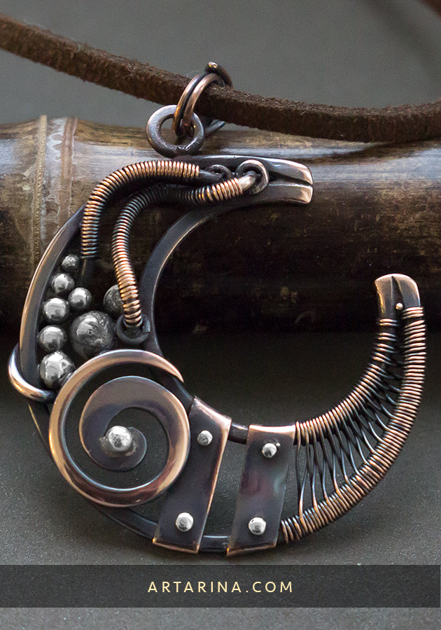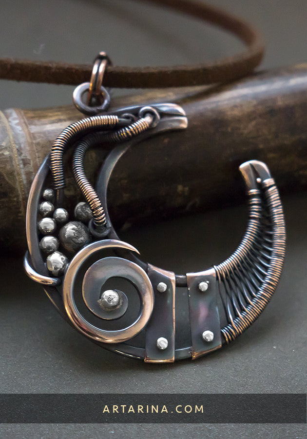 Mixed metal copper and silver steampunk post apocalyptic crescent moon necklace.