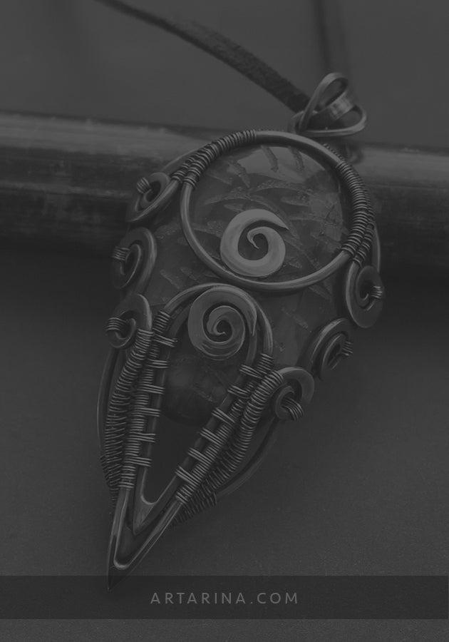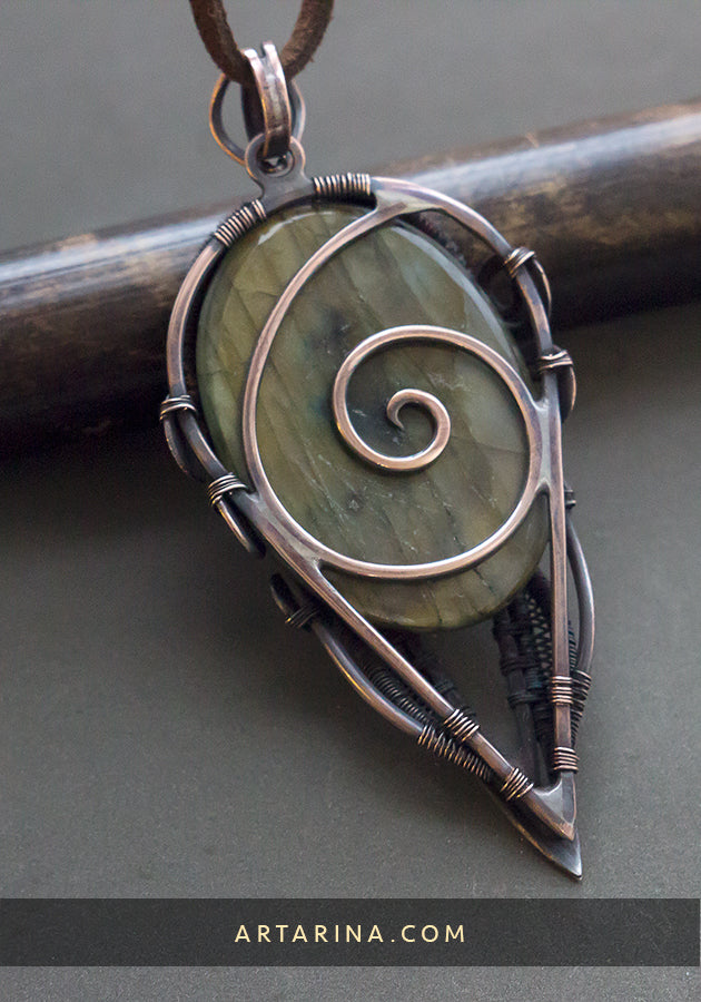 Alternative jewelry. Mixed metal Spiral symbol wire wrap pendant with carved labradorite