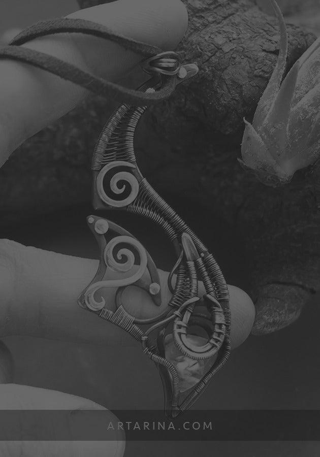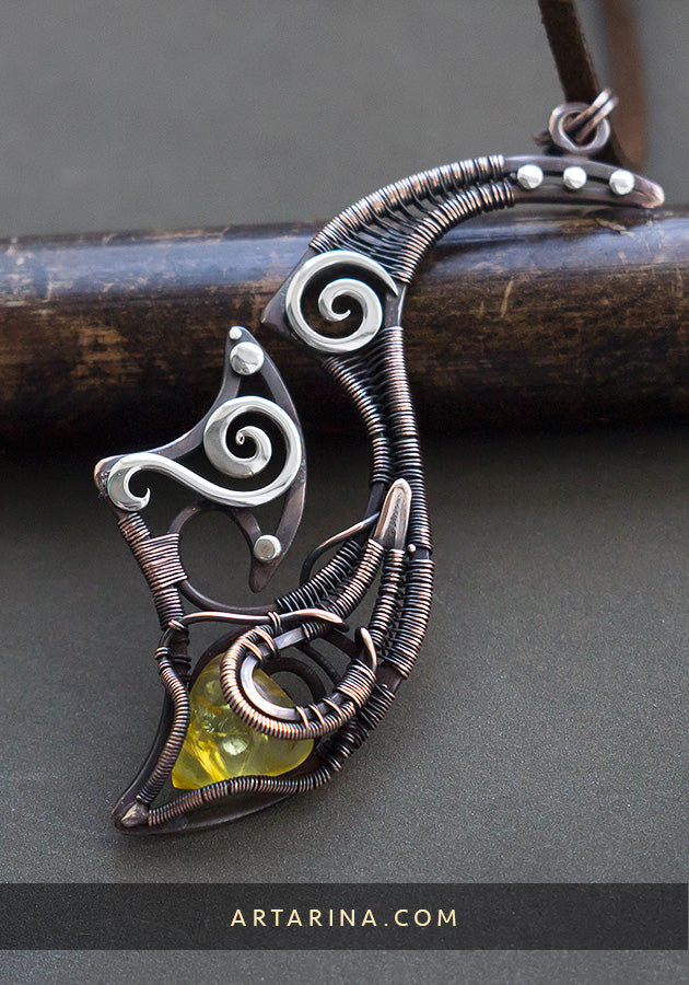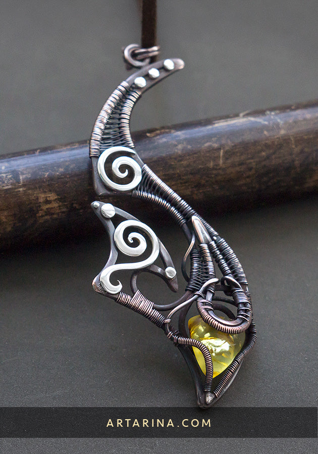 Copper Fish hook Hei Matau wire wrapped steampunk pendant with amber