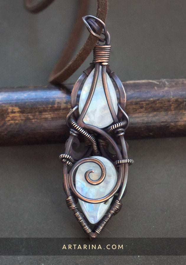 Copper wire wrapped necklace with two moonstones