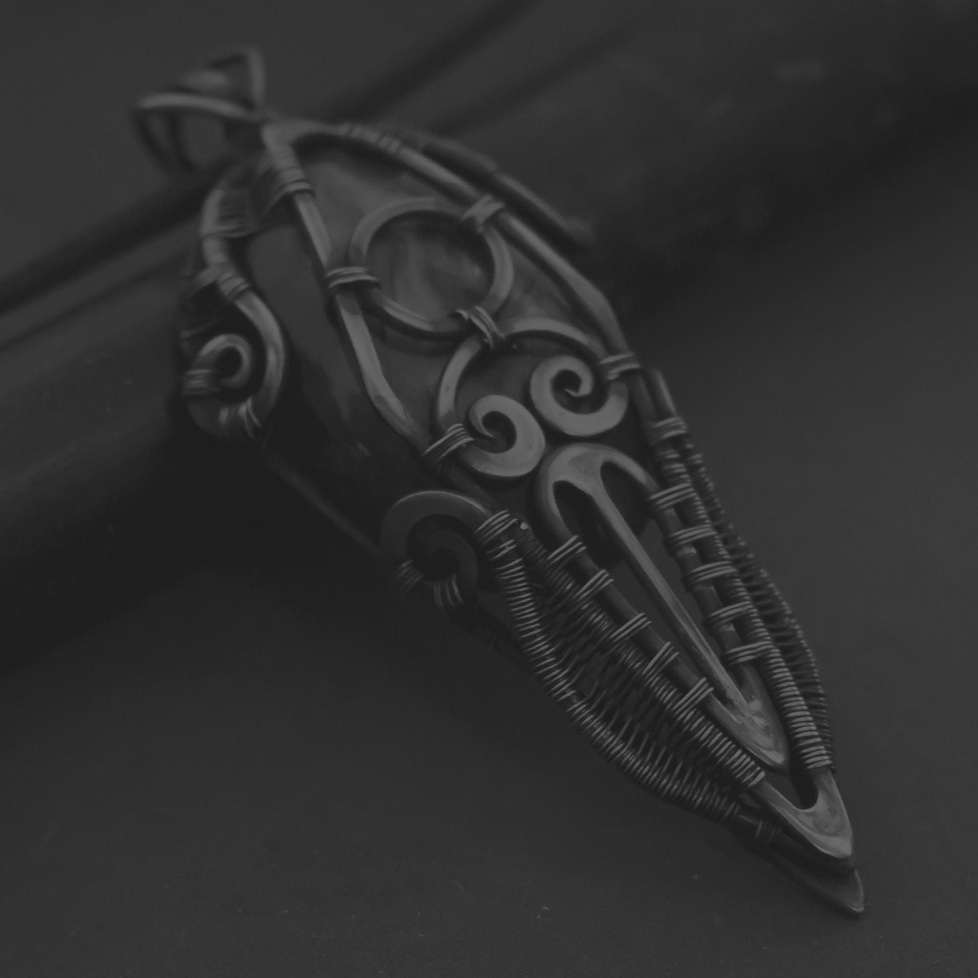 Wire wrapped jewelry for men. Intricate filigree hand weaved pendant with blue and green stone. Dark brown patina freeform necklace